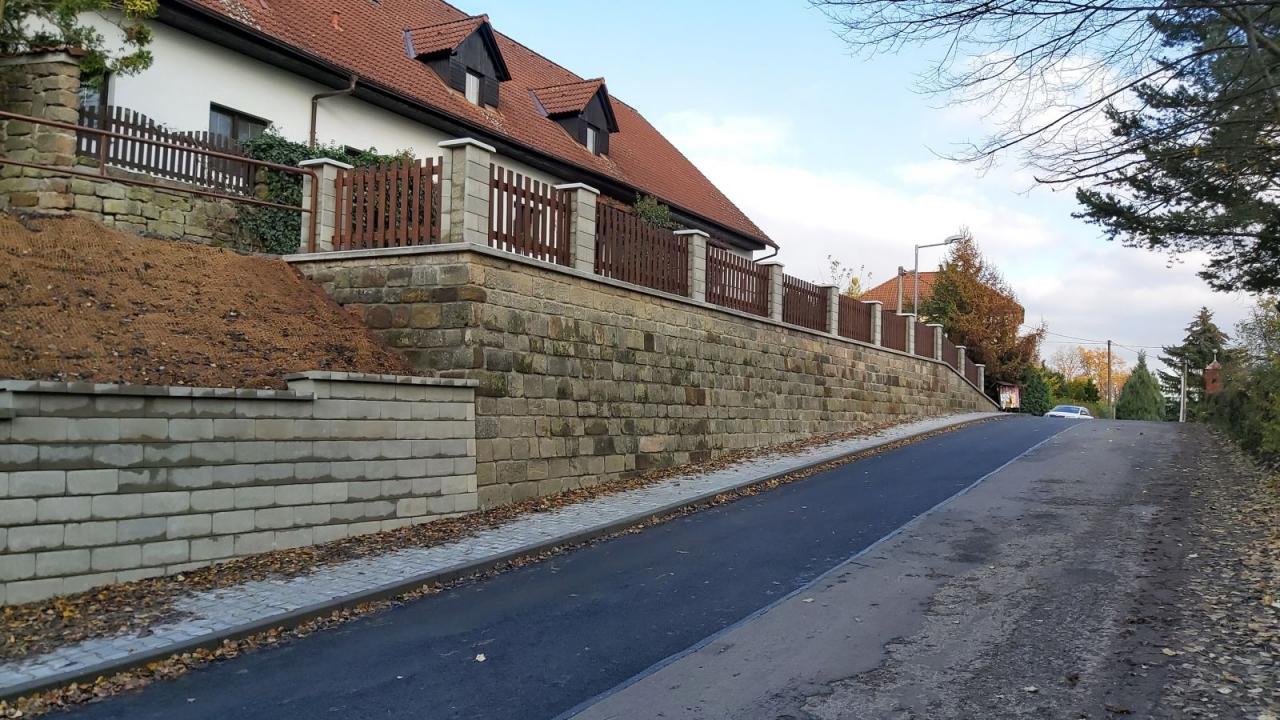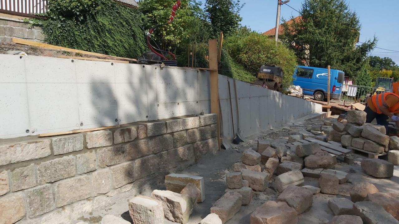 V první etapě bude postupně odbouráno oplocení na vrcholu zdi, bude rozebrána stávající pískovcová zeď, odebrána zemina a postupně od nejnižšího místa (vjezdu k nemovitosti čp.27) budou vybudovány nové základy a betonová opěrná zeď.